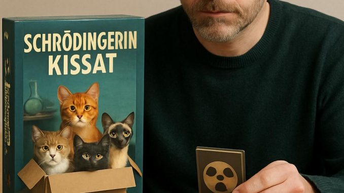 *Schrödingerin Kissat* yhdistää pokerinaamat ja fysiikkavitsit kepeään, 20 minuuttia kestävään bluffauspeliin. Tässä laatikossa kissat eivät ole koskaan täysin turvassa – eikä kaverin ilmeestäkään voi olla varma.
